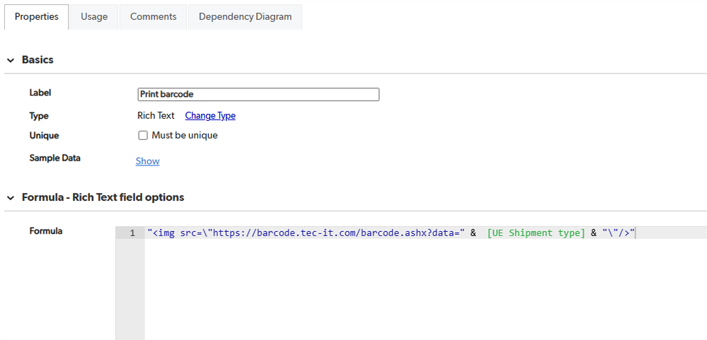 "<img src=\"https://barcode.tec-it.com/barcode.ashx?data=" & [First Name] & "\"/>"Note: In my example I'm using a field called "First Name", change to the name of your field. Also the exact syntax will depend on what kind of content is contained in your field, but this should work assuming it's plain text.