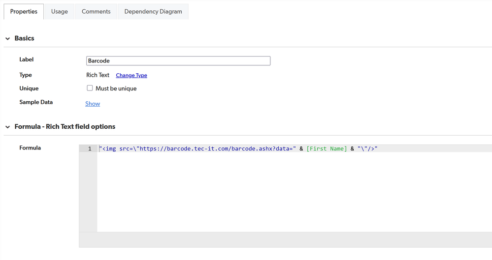I'm creating a document template and I want to add a barcode of a text field. I've added this to the source directly from a rich text formula field.