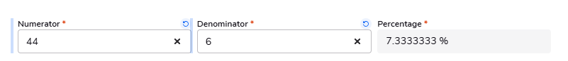I have a Formula Text that calculates and displays data based on the numbers users enter in two other numeric fields. Example: When a user enters a number in my Numerator and Denominator fields, my formula field divides those numbers and then displays the answer in the Percentage field (as shown in the screenshot below).