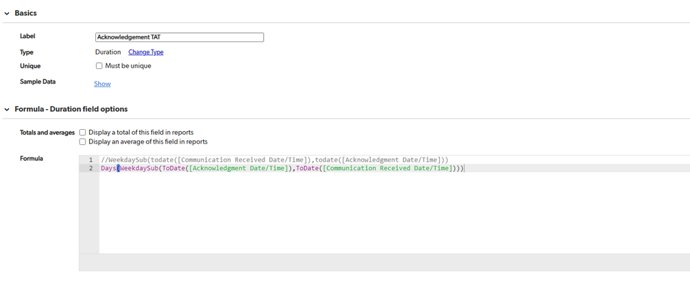 I am using the formula below for a duration TAT. I have checked off the HH:MM:SS for the type and it is still displaying 0:00:00 for things that are one hour from rec'd to acknowledged time entered