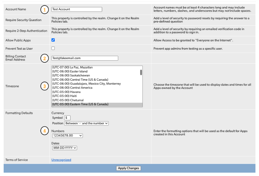 - Time Zone - Choose the time zone that will be used to display dates and times for all apps owned by the account unless an app is set with a custom time zone.
