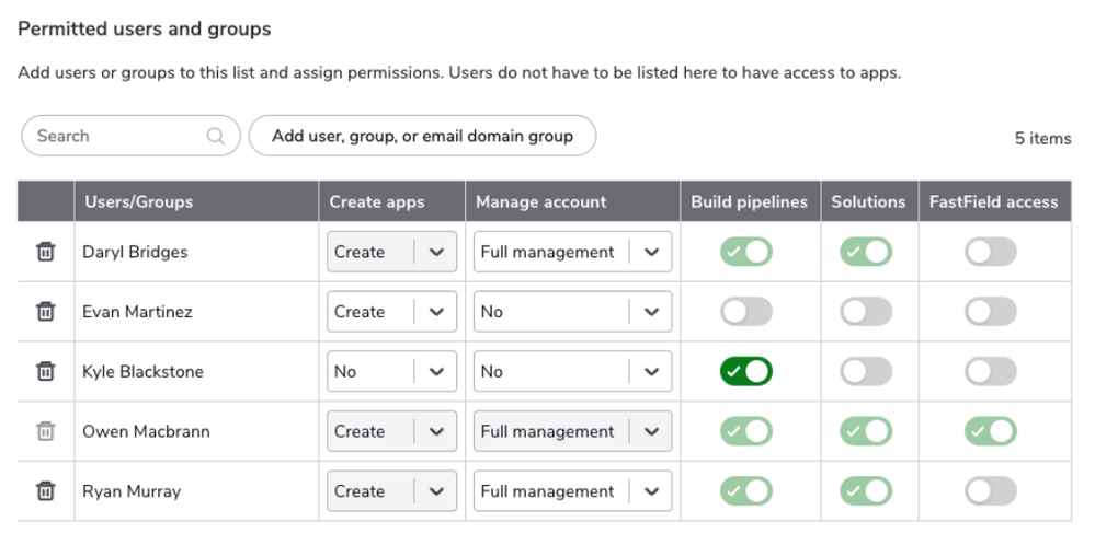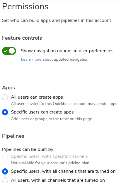 On your Permissions page you can also set up default permissions for all of your users that impact who can build apps, create automated workflows known as pipelines, and use features such as plugins and user tokens. Allowing all users to create apps and pipelines allows you to source ideas and new apps from more of your team, while restricting access to specific users will give you more control over who can create apps and workflows in your account.